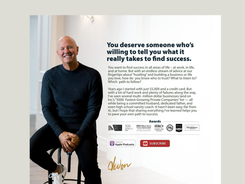 Through intuitive navigation, captivating visuals, and compelling content, we’ve brought Devon’s brand to life online. The website serves as a hub for entrepreneurs seeking real advice and guidance, showcasing Devon’s expertise and authenticity.